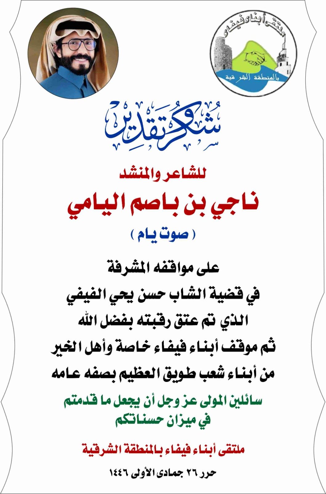 حيث تم تلبية الدعوة لهذه المناسبة الكريمة من رئيس ملتقى ابناء فيفاء بالمنطقه الشرقيه الاستاذ يحيى حسن المدري والشاعر والمنشد عبدالعزيز والاستاذ خالد الفيفي وتقديم بعض الهدايا التذكارية نيابة عن أبناء فيفاء للمنشد ناجي بن باصم اليامي عبارة عن بشت وشنطة من أفخر الأطياب والعود ودرع يحتوي على عبارات تعبر عن مواقف الشاعر اليامي مع قبائل فيفاء في قضية الشاب حسن يحي الفيفي بالقصائد والشيلات والنشر والتبرع السخي منه ومن جماعته الأوفياء وهذا قليل من ما يستحقه ذلك العلم المعروف على مستوى المملكة والخليج .