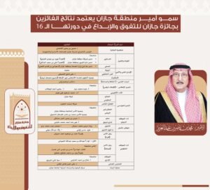 اعتمد صاحب السمو الملكي الأمير محمد بن ناصر بن عبدالعزيز أمير منطقة جازان، رئيس مجلس أمناء جائزة جازان للتفوق والإبداع، نتائج الفائزين بالجائزة في دورتها السادسة عشرة لعام 1445- 1446 هـ