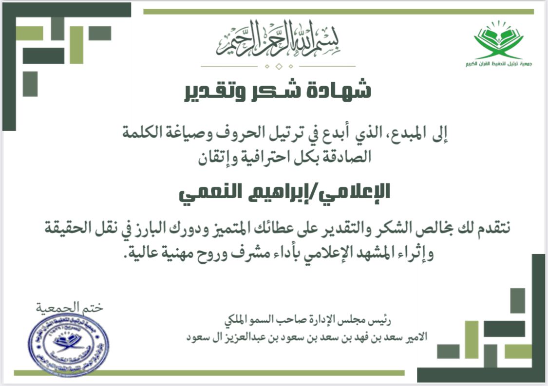 شهادة شكر وتقدير للأستاذ: إبراهيم النعمي