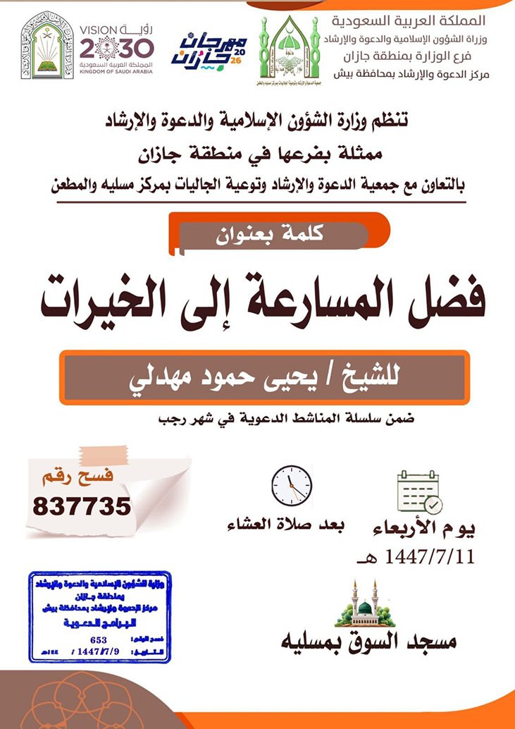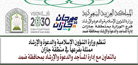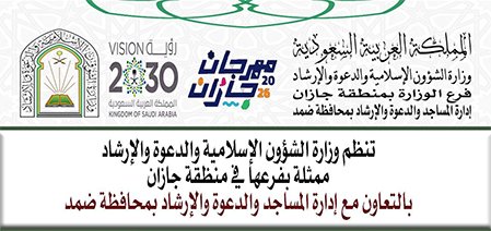 تُنظّم وزارةُ الشؤون الإسلامية والدعوة والإرشاد، ممثّلةً بفرعها بمنطقة جازان، إدارات المساجد في محافظات ضمد وصبيا وبيش، وبالتعاون مع جمعية الدعوة والإرشاد وتوعية الجاليات بمركزي مسلية والمطعن، سلسلةً من المناشط الدعوية الهادفة، تزامنًا مع فعاليات مهرجان جازان 2026م.