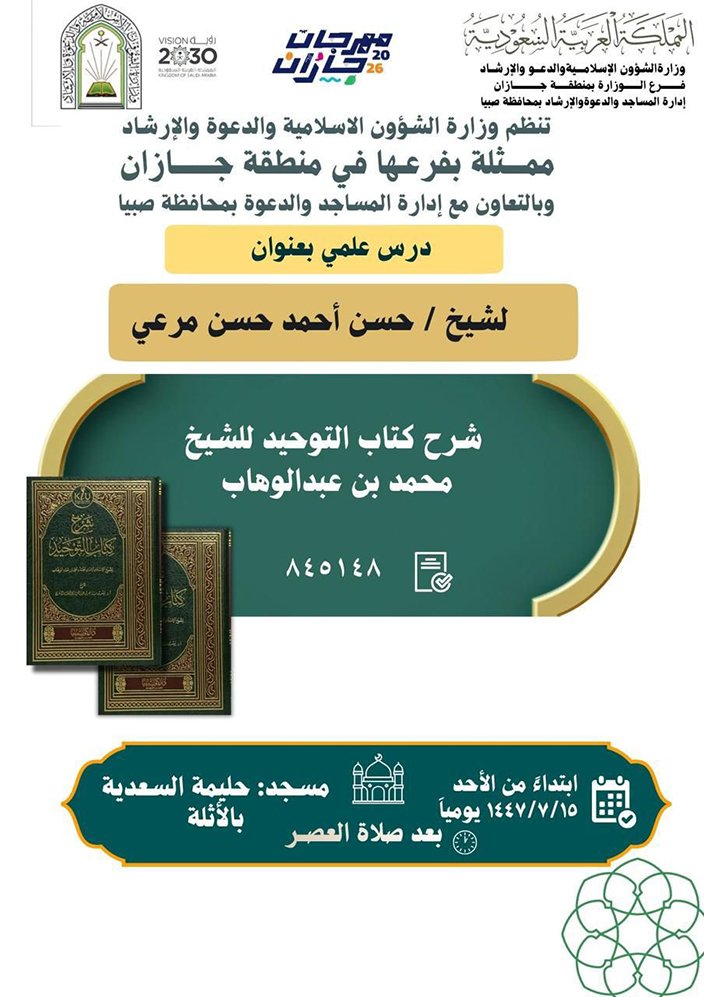كما يُقام مساء الأحد القادم الخامس عشر من شهر رجب بقرية الأثلة التابعة لمحافظة صبيا، في مسجد حليمة السعدية، درسٌ علمي يتناول “شرح كتاب التوحيد” للشيخ محمد بن عبدالوهاب – رحمه الله –، بعد صلاة العصر مباشرةً.