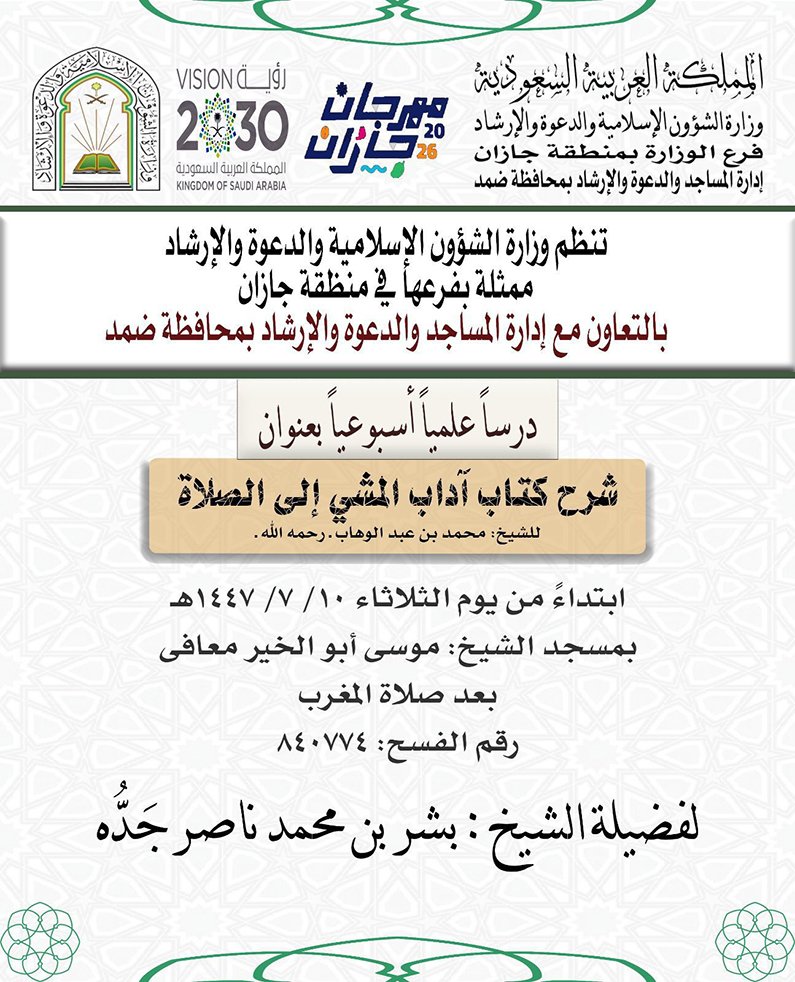 وتنطلق هذه المناشط مساء اليوم الثلاثاء الموافق العاشر من شهر رجب لعام 1447هـ من محافظة ضمد، من خلال درسٍ أسبوعي بعنوان “شرح كتاب آداب المشي إلى الصلاة” للشيخ محمد بن عبدالوهاب – رحمه الله –، وذلك بعد صلاة المغرب مباشرةً في مسجد موسى أبو الخير معافا.