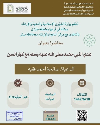 وانطلقت المحاضرات صباح يوم الثلاثاء 18 جمادى الآخرة 1447هـ بمحافظة بيش، حيث قدّم مركز الدعوة والإرشاد محاضرة عبر البث المباشر بعنوان “هدي النبي محمد صلى الله عليه وسلم مع كبار السن” ، تناولت أهمية احترام كبار السن والعناية بهم والإحسان إليهم.