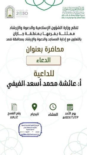 كما تُنظّم إدارة المساجد والدعوة والإرشاد بمحافظة ضمد مساء الأحد 23 من الشهر نفسه محاضرة بعنوان “الدعاء” ، عن بُعد عبر البث المباشر.