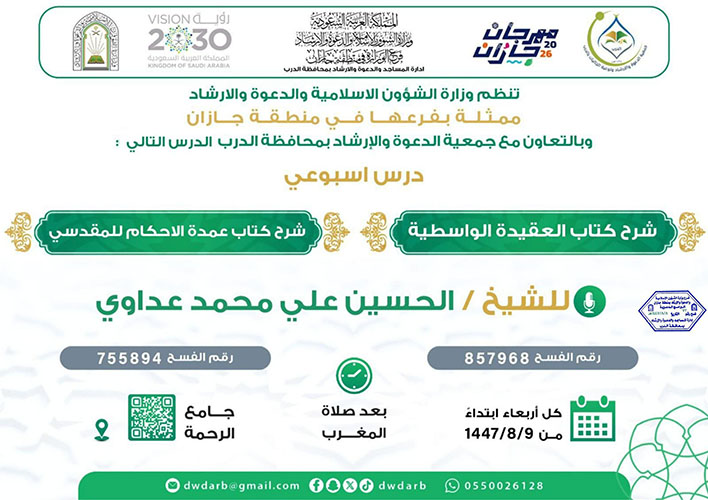 تُنفّذ وزارةُ الشؤون الإسلامية والدعوة والإرشاد، ممثّلةً بفرعها في منطقة جازان، وبالتعاون مع جمعية الدعوة والإرشاد وتوعية الجاليات بمحافظة صبيا، الجولةَ الدعويةَ الثانية ضمن البرنامج الدعوي المصاحب لفعاليات مهرجان جازان 2026م، وذلك ابتداءً من مساء يوم غدٍ الأربعاء السادس عشر من شهر شعبان لعام 1447هـ، وحتى مساء الرابع والعشرين من الشهر ذاته.