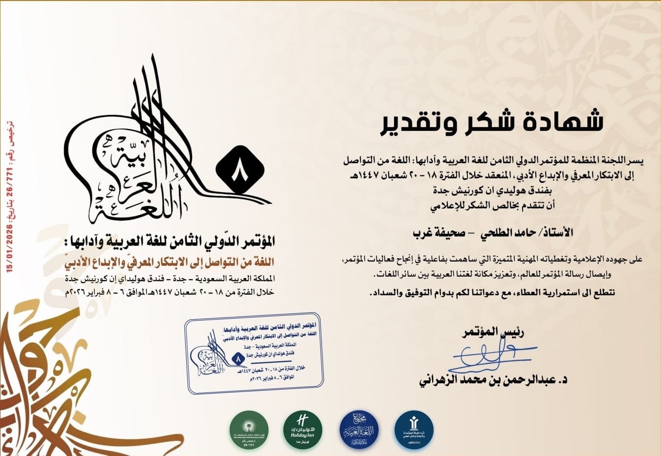 في لحظةٍ احتفت فيها الكلمة بأهلها، وتوشّحت اللغة العربية بأبنائها البررة، نال الإعلامي حامد محمد الطلحي الهذلي شهادة شكر وتقدير من إدارة المؤتمر الدولي الثامن للغة العربية، تقديرًا لجهوده الإعلامية وإسهاماته في خدمة العربية وتعزيز حضورها في المشهد الثقافي والإعلامي.