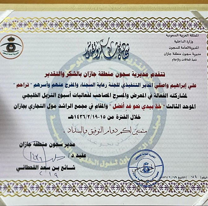 ثم رشحت مدير تنفيذي للجنة رعاية السجناء والمفرج عنهم واسرهم( تراحم )من قبل مدير إدارة سجون المنطقة بموجب طلب من أمير منطقة جازان وكذلك مدير عام الشئون الاداريه والماليه بالإماره الأستاذ علي زعله كونه رئيس للجنه حتى عام ١٤٤٢ قدمة استقالة نظرا لظروفي الصحيه..