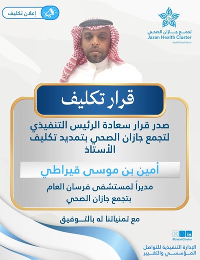 أصدر الرئيس التنفيذي لتجمع جازان الصحي الأستاذ فالح بن ناصر الشهراني قرارا بتمديد تكليف الأستاذ امين موسى قيراطي مديرا لمستشفى فرسان العام لعام 2026، وذلك استمرارا لجهوده القيادية وما حققه المستشفى من منجزات نوعية في تطوير خدمات الصحة وتعزيز جودة الرعاية