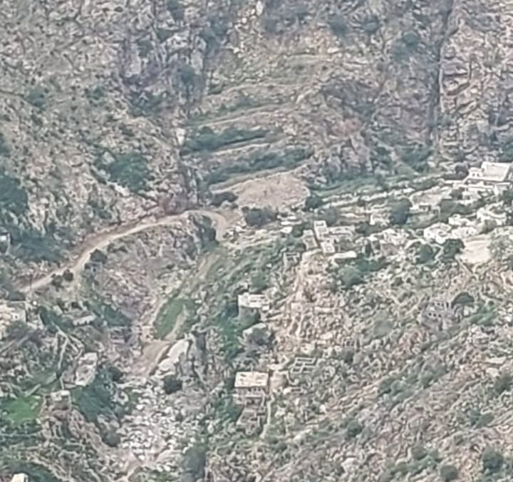 منظر أخاذ يختصر لك كثيرا من الشرح، هذا هو وادي عناء الذي مررنا به في صباح هذا اليوم، وسننزل إليه بعد قليل في طريقنا للمغادرة، وبعد أن تملينا من هذه المناظر الماتعة والجميلة، اخذنا بطريق العودة من حيث اتينا، وإلى العنيف حيث المفرق السابق، متجهين منه إلى اليسار بالطريق الرئيسي إلى الأسفل، انطلقنا على بركة الله وحفظه، بعد أن ودعنا من هنا مضيفينا الكرماء.