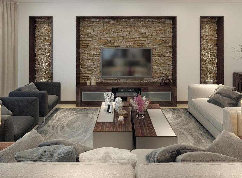 - يمكن إكساء الجدار الداخلي بالحجر الذي يشبه ذلك الخارجي، وإنما باستخدام قطع أصغر منه. ويرغب البعض في حضور الحجر المنقوش، الذي يدمج بالخشب النافر، عند إعداد وحدة التلفزيون، مع توظيف الإضاءة. وتثبت في الوسط شاشة التلفاز (أو مرآة ضخمة أو لوحة فنية).