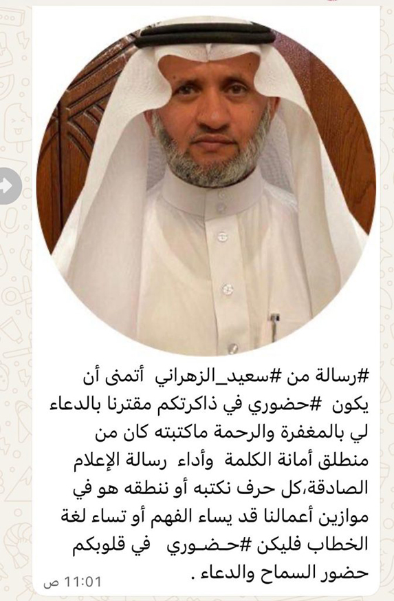 لم يكتب زميلُنا الإعلامي الراحل، الأستاذ سعيد بن عبدالله الزهراني -رحمه الله- من أجل مجدٍ شخصي أو مصلحةٍ تعود عليه، بل كان صادقًا مع نفسه، أمينًا مع مجتمعه، نقيَّ السريرة، نزيهَ القلم.