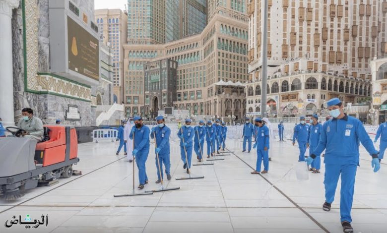 وأضاف “الجابري” تستمر فرق التعقيم وعلى مدار الساعة باستخدام قرابة (33 ألف لتر) من المعقمات لتعقيم جميع الأسطح والسجاد وتجهيز وتوزيع أكثر من (500) جهاز آلي لتعقيم الأيد بخاصية الاستشعار و(20 )جهاز بايوكير و(11) ربوت تعقيم كما يتم توزيع 30 ألف كمامة بديلة عبر كونترات خاصة وفرق في كافة جنبات المسجد الحرام.