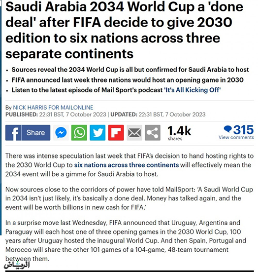 أكدت صحيفة “ديلي ميل” البريطانية أن المملكة العربية السعودية ستنظم بطولة كأس العالم 2034 بشكل مؤكد، حيث سيمنح الاتحاد الدولي لكرة القدم “فيفا” للجانب السعودي حق استضافة البطولة بصورة رسمية..