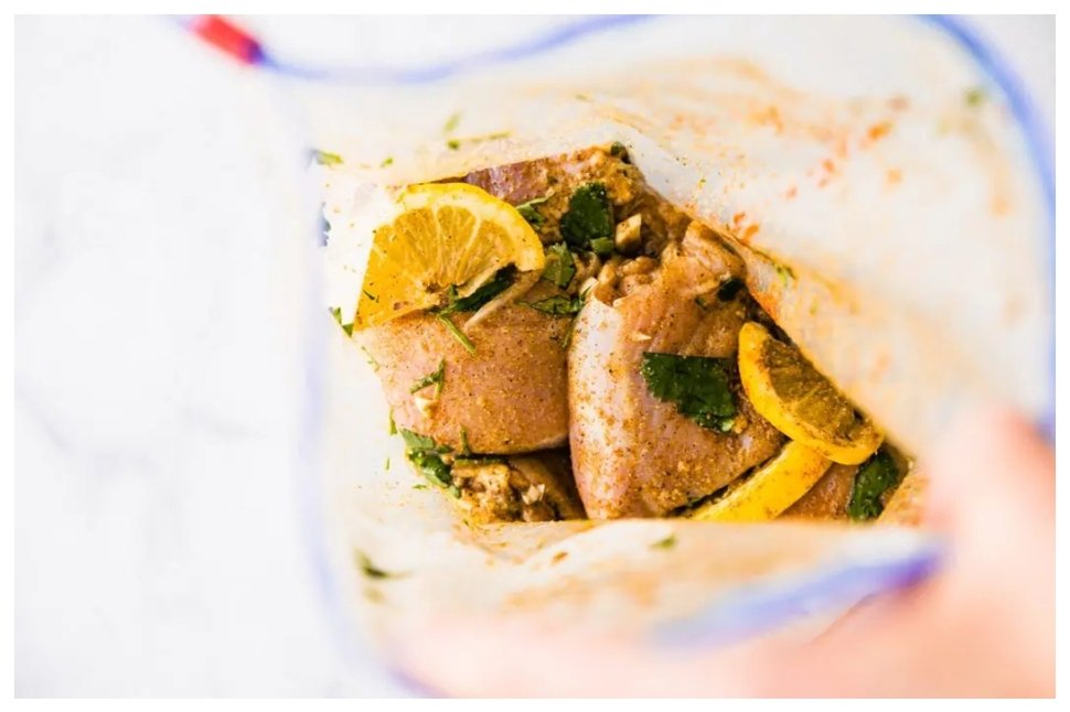 ضعي قطع الدجاج في كيس بلاستيكي قابل لإعادة الإغلاق مع الثوم والهيل والقرفة والكمون والفلفل وباقي مكونات التتبيلة، ثم ضعيه في الثلاجة لمدة ساعة ونصف على الأقل.