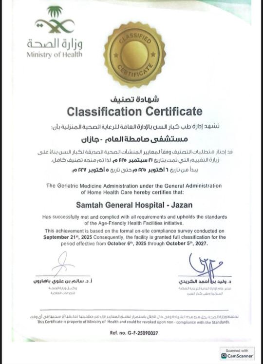 برعاية وزير الصحة تم تكريم مستشفى صامطة العام من قبل مساعد وزير الصحة الدكتور محمد العبد العال والذي حصل على الإعتماد كمستشفى صديق لكبار السن واستلم التكريم مدير مستشفى صامطة العام /الأستاذ جبريل بن عبده مهاجر والأستاذ/ محمد عطيف كليبي مشرف الجودة بقسم الأشعة مثمناً جهود جميع الموظفين في المستشفى حيث قد إجتاز متطلبات التصنيف وفقا لمعايير المنشات الصحية الصديقة لكبار السن بناء على زيارة التقييم التي تمت بتاريخ ٢١ سبتمبر 2025م لذا تم منحه تصنيف كامل يبدأ من تاريخ 7 أكتوبر 2025م حتى تاريخ 7 أكتوبر 2027 م