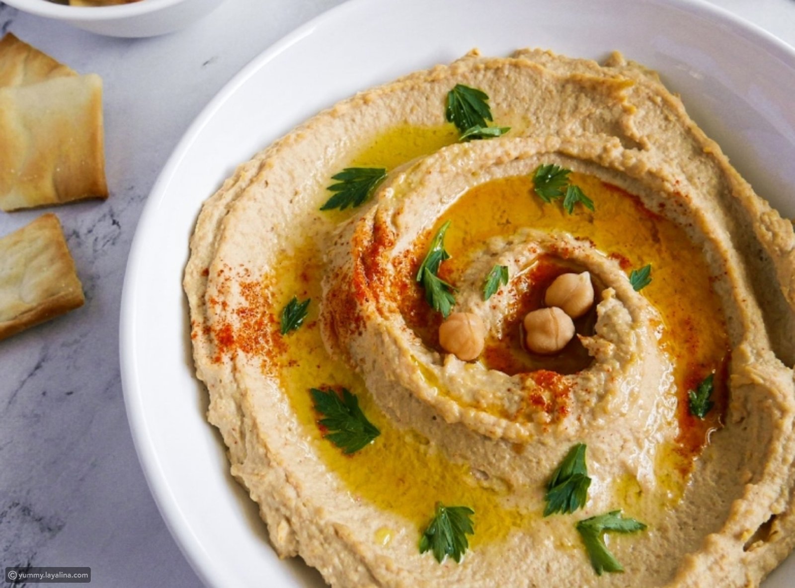 - قدمي الحمص في طبق ورشي عليه القليل من البابريكا وزيت الزيتون.