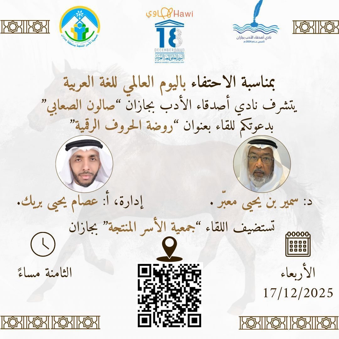 «روضة الحروف الرقمية» الأربعاء 2025/12/17 م الساعة الثامنة مساء بجمعيّة الاسر المنتجه مع الدكتور سمير بن يحيى معبر وإدارة الأستاذ عصام يحيى بريك، في أمسيةٍ تتقاطع فيها ظلال الماضي مع إشراقة المستقبل، وتتمازج فيها ضادُنا العريقة مع فضاءات التقنية اللامحدودة.
