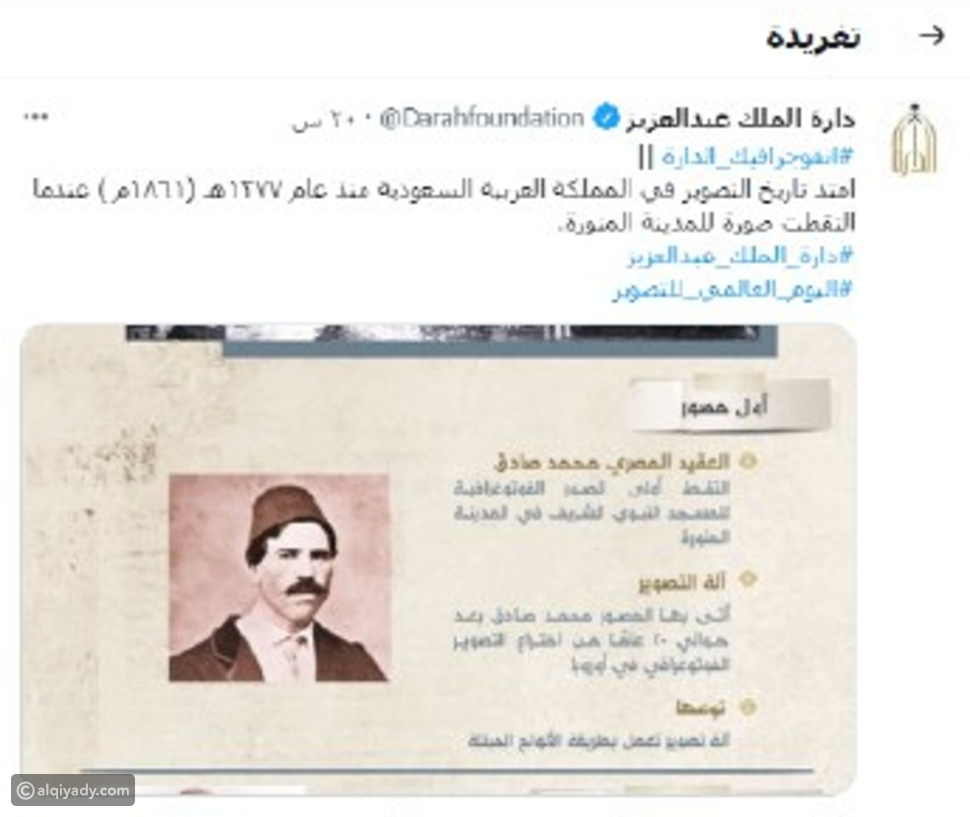 قالت دارة الملك عبد العزيز خلال تغريدتها: “امتد تاريخ التصوير في المملكة العربية السعودية منذ عام ١٢٧٧هـ /١٨٦١م، عندما التقطت صورة للمدينة المنورة”.