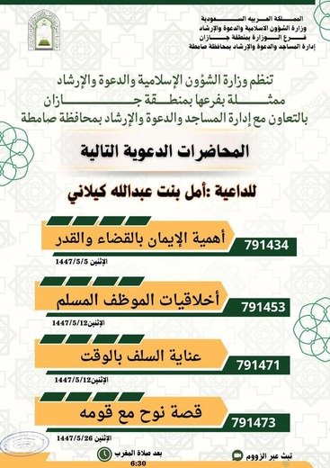 الجدير بالذكر أنه أُقيمت أيضًا بمحافظة صامطة محاضرات تناولت أهمية الإيمان بالقضاء والقدر، وأخلاقيات الموظف المسلم، وعناية السلف بالوقت، وتُختتم هذه السلسلة في نهاية الشهر بمحاضرة قصة نوح عليه السلام مع قومه.