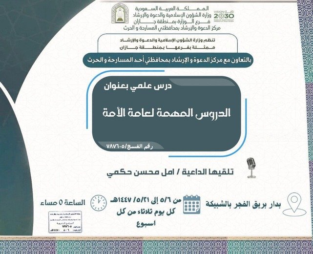 يواصل فرع وزارة الشؤون الإسلامية والدعوة والإرشاد بمنطقة جازان ممثلاً بإدارة مساجد صامطة ومركز الدعوة بمحافظتَيْ أحد المسارحة والحُرّث، تنفيذ مناشطه الدعوية التي انطلقت مطلع الشهر الحالي وتستمر حتى نهايته.